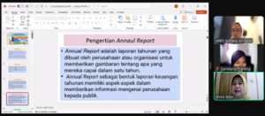 Pelatihan ini dilaksanakan selama 2 hari, tanggal 17 s.d 18 September 2024 via Zoom Meeting. Pelatihan diikuti oleh seorang peserta yang berasal dari PT. MRT, dimana peserta merupakan seorang dari tingkatan managerial di perusahaan tersebut. Pelatihan ini diselenggarakan oleh Gemilang Training dengan instruktur yang merupakan seorang tenaga pengajar yang ahli dalam bidang Annual Report. Pelatihan berjalan dengan lancar dengan antusiasme peserta yang tinggi, banyaknya interaksi aktif, dan juga diskusi yang dilakukan